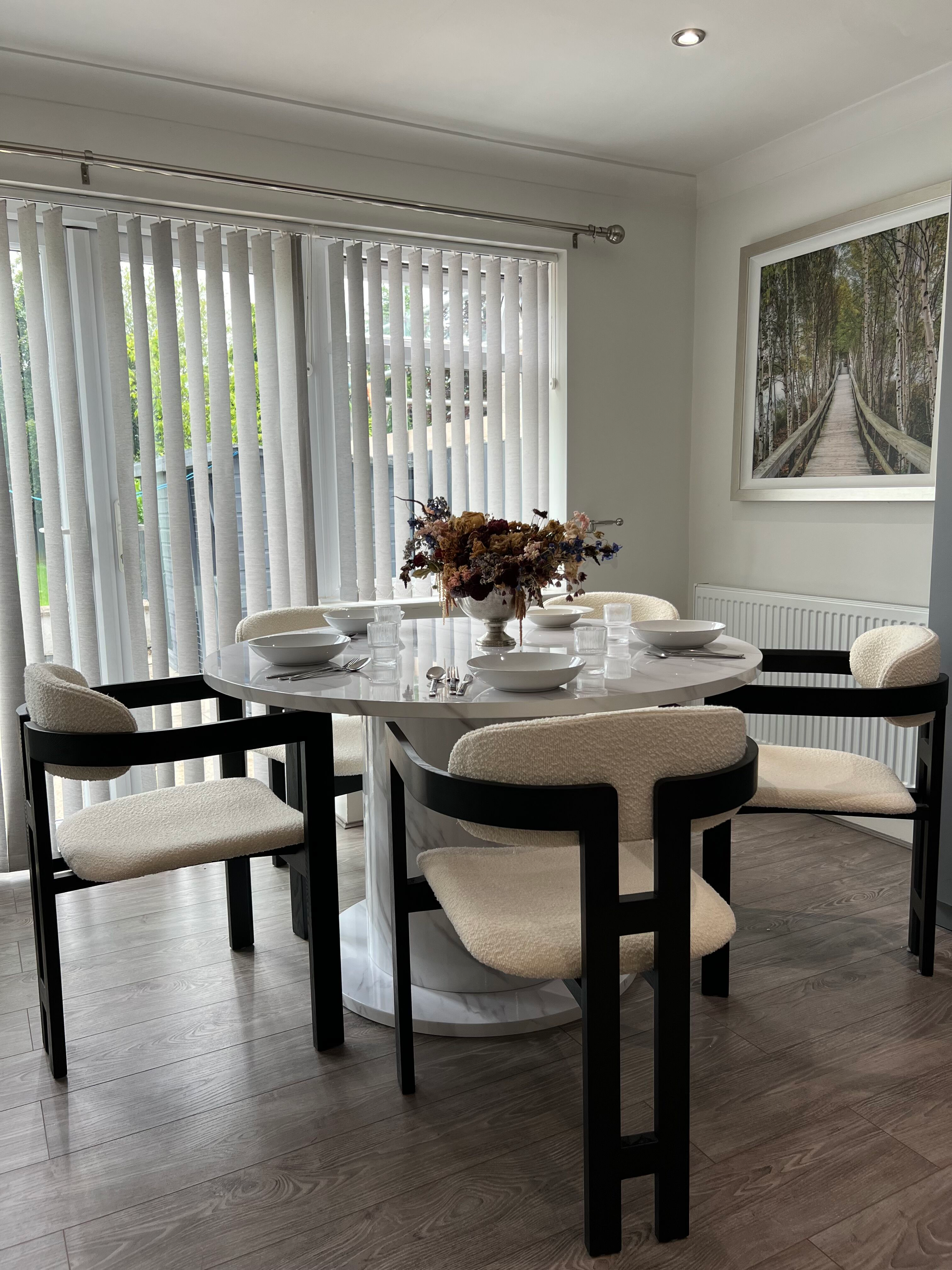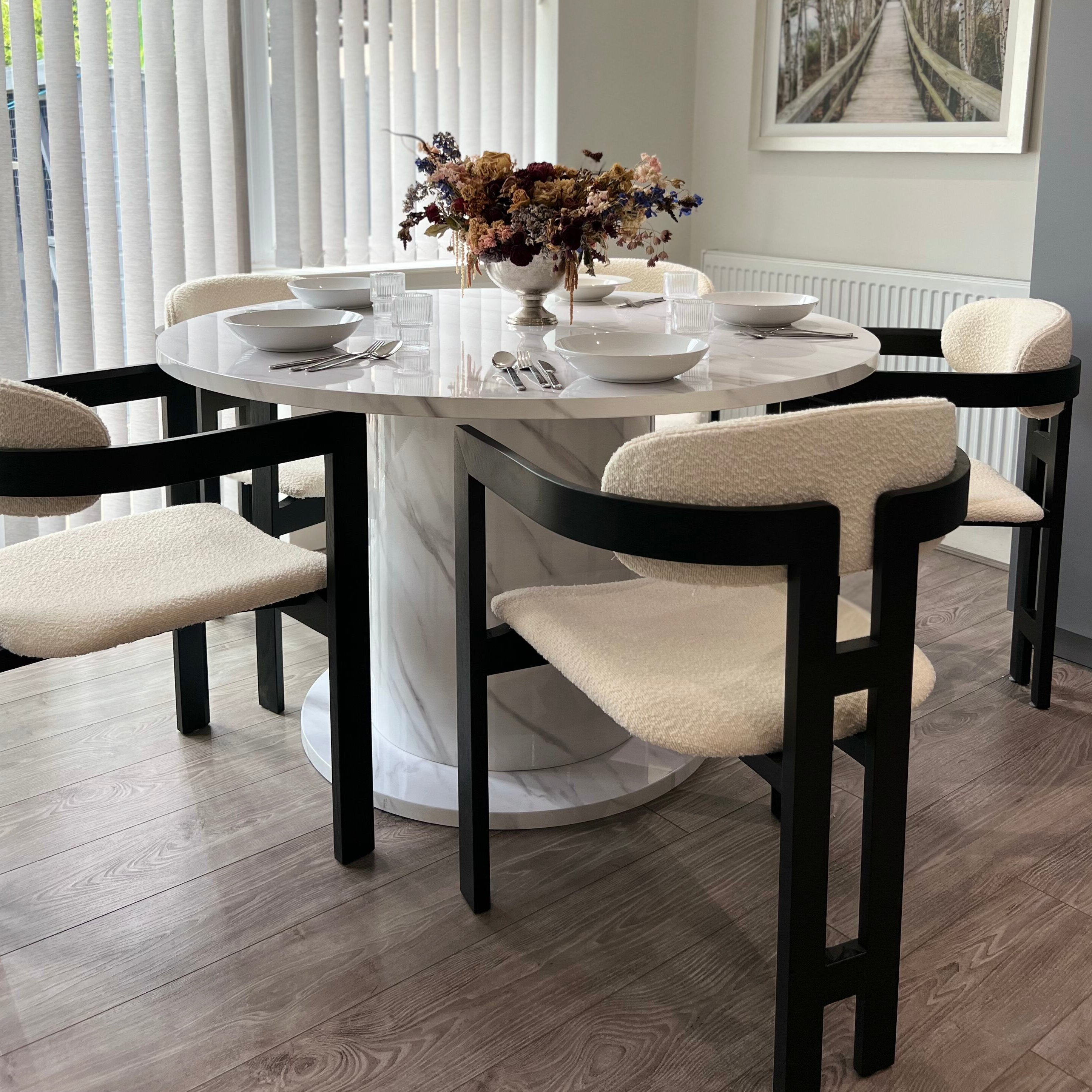 Upgrade your dining area with a dazzling touch using our Rio chair and Olivia dining table. The Rio chair combines style and comfort with its boucle fabric padded seat and backrest, complemented by a bold black frame for the legs and arms. As for the Olivia dining table, it's a masterpiece of elegance, featuring a clean and minimalist design with a lustrous gloss finish and a captivating bone white marble pattern. Meticulously crafted with a sturdy column for support, it effortlessly marries modern aesthetics with timeless charm, adding opulence and warmth to your dining space. Embrace luxury and refined taste with this stunning set, perfect for both contemporary and classic interiors.