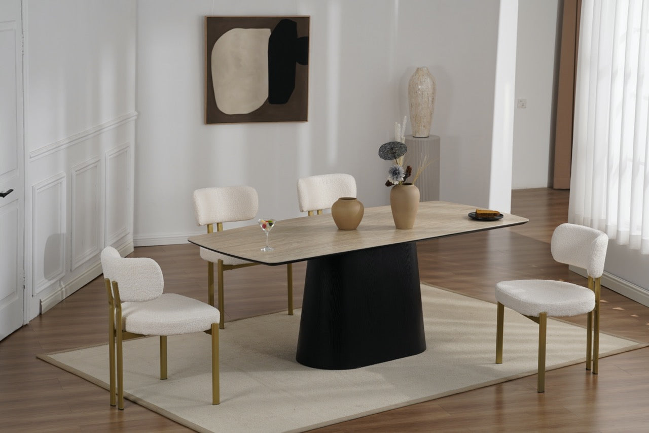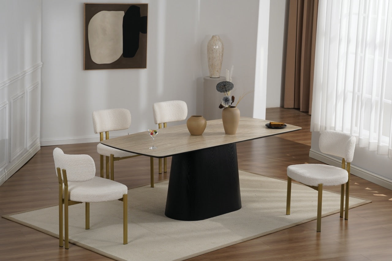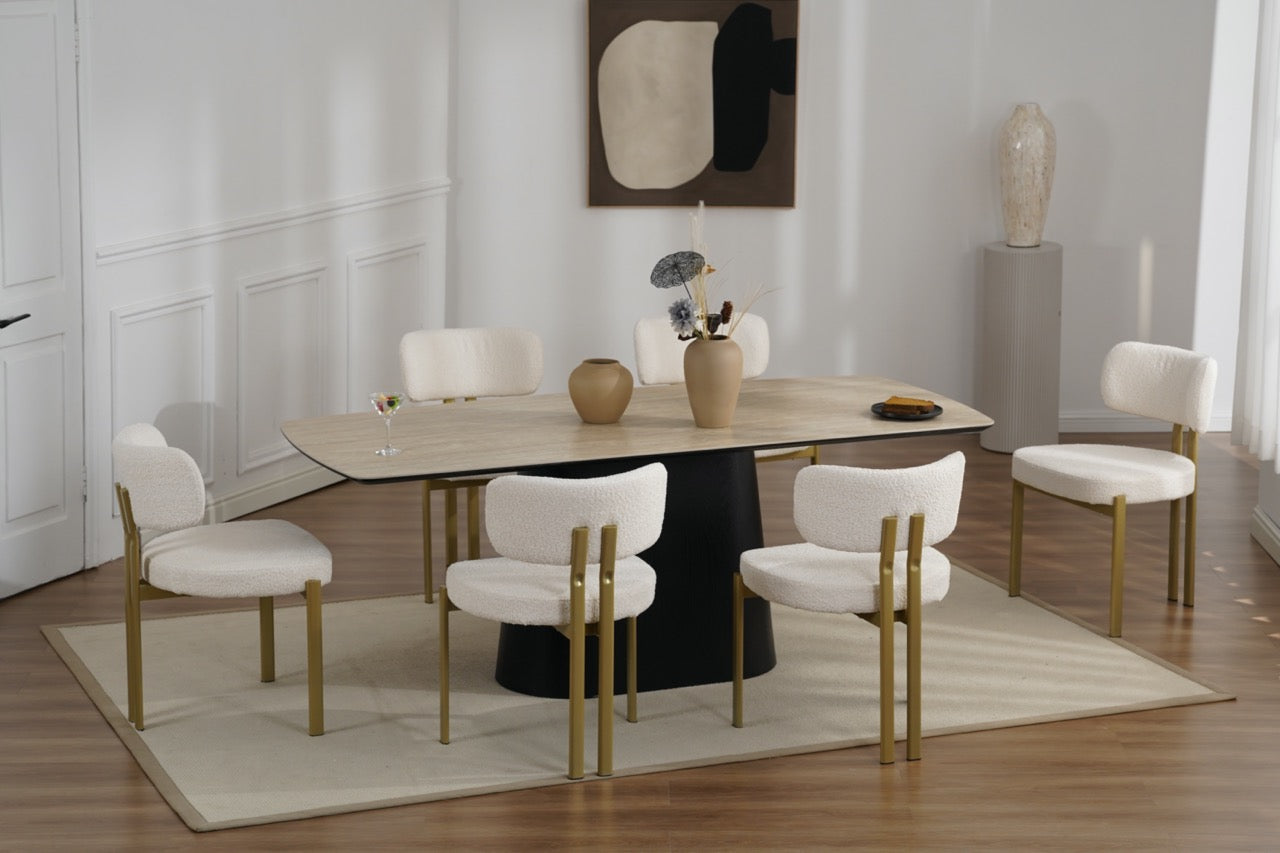 The Maya Dining Chair combines soft texture with a hint of shine. Upholstered in a warm, boucle-inspired fabric and finished with matte gold legs, it offers a refined balance of comfort and contemporary elegance.
