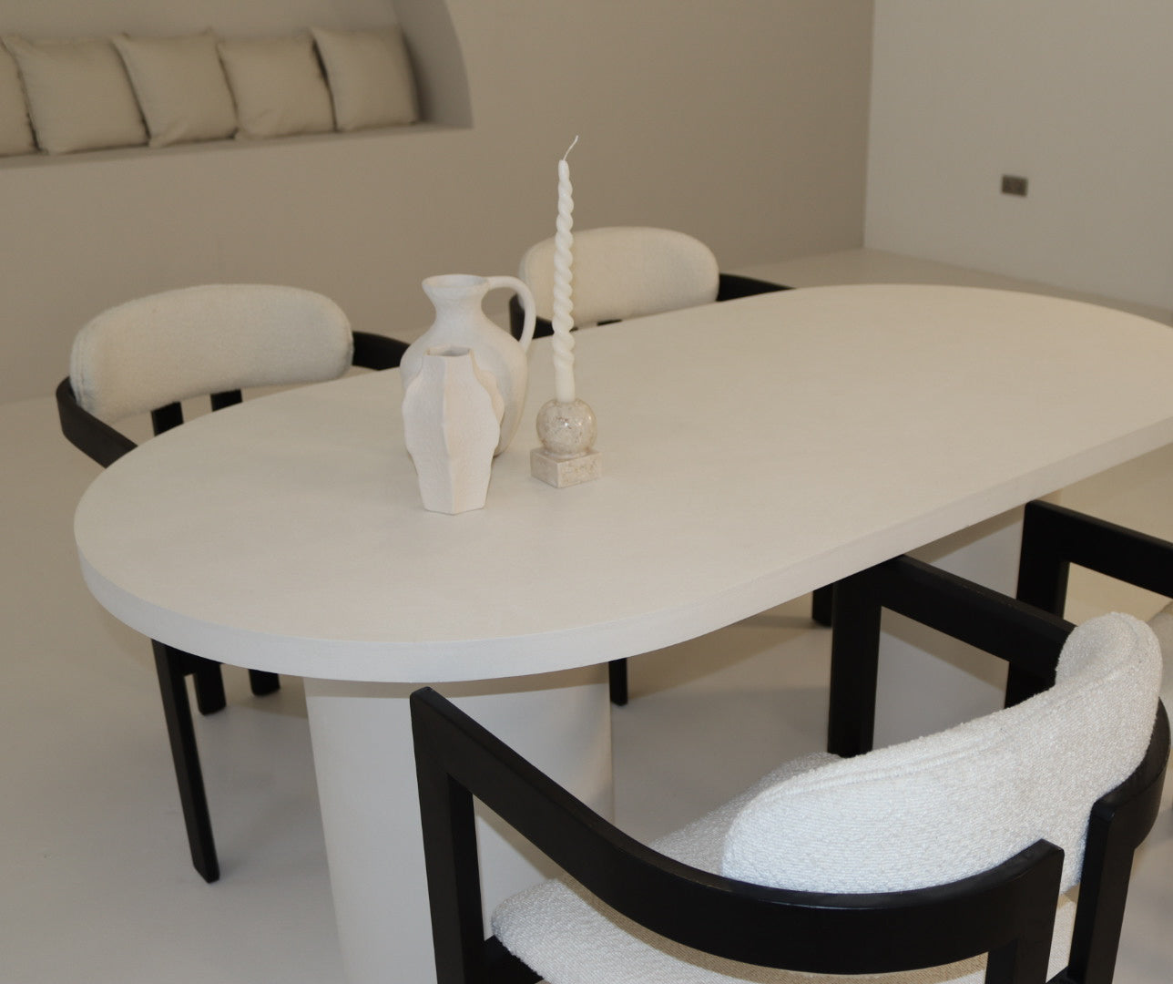 Distinctive pillar legs and bold curves give the Cloud Table its statement silhouette, while the artisanal finish ensures that no two pieces are ever exactly alike. Subtle variations, tonal shifts, and small imperfections are an inherent part of the micro cement process, adding character and authenticity to every table.