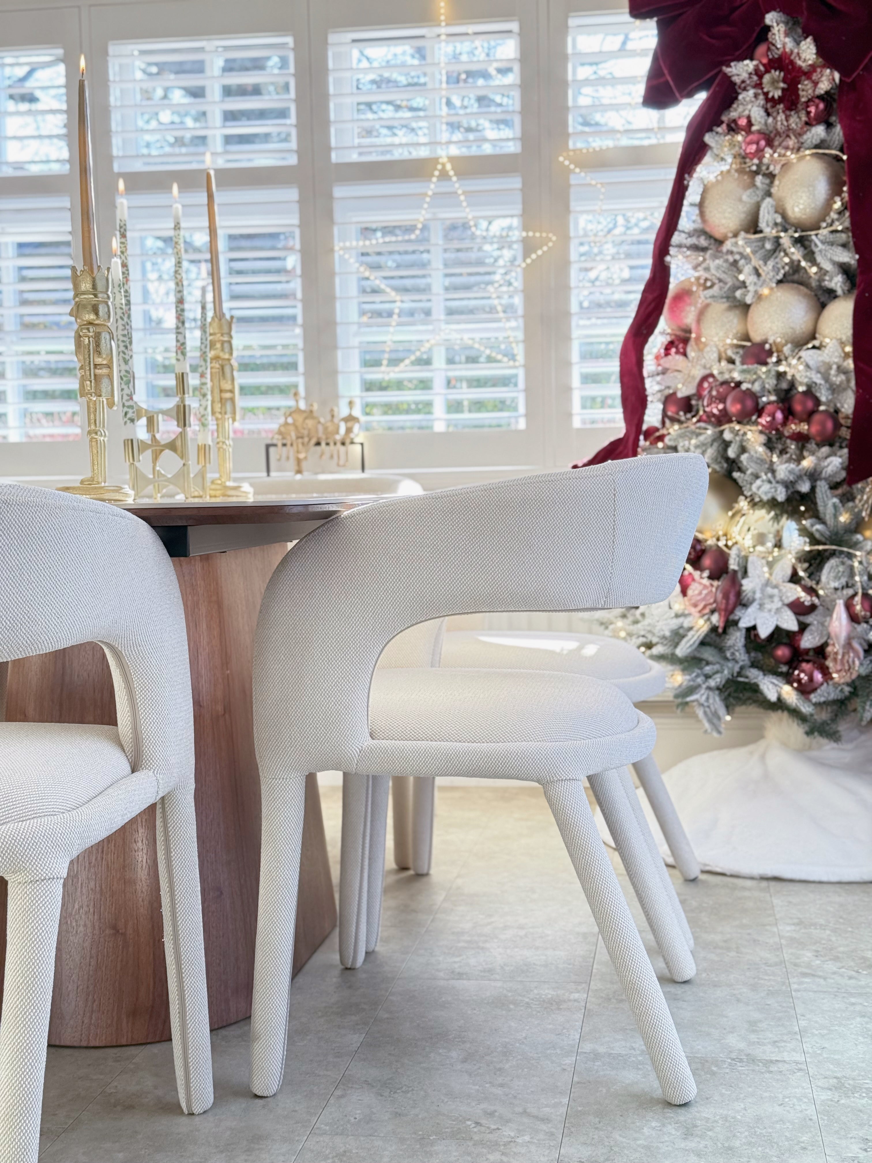 The rich walnut tones of the Eton Table contrast beautifully with the soft neutral fabric of the Cole Chairs, creating a harmonious blend of grounded warmth and modern calm. This pairing suits a variety of interior styles, from contemporary to timeless minimalist spaces, making it a versatile and stylish choice for any home.