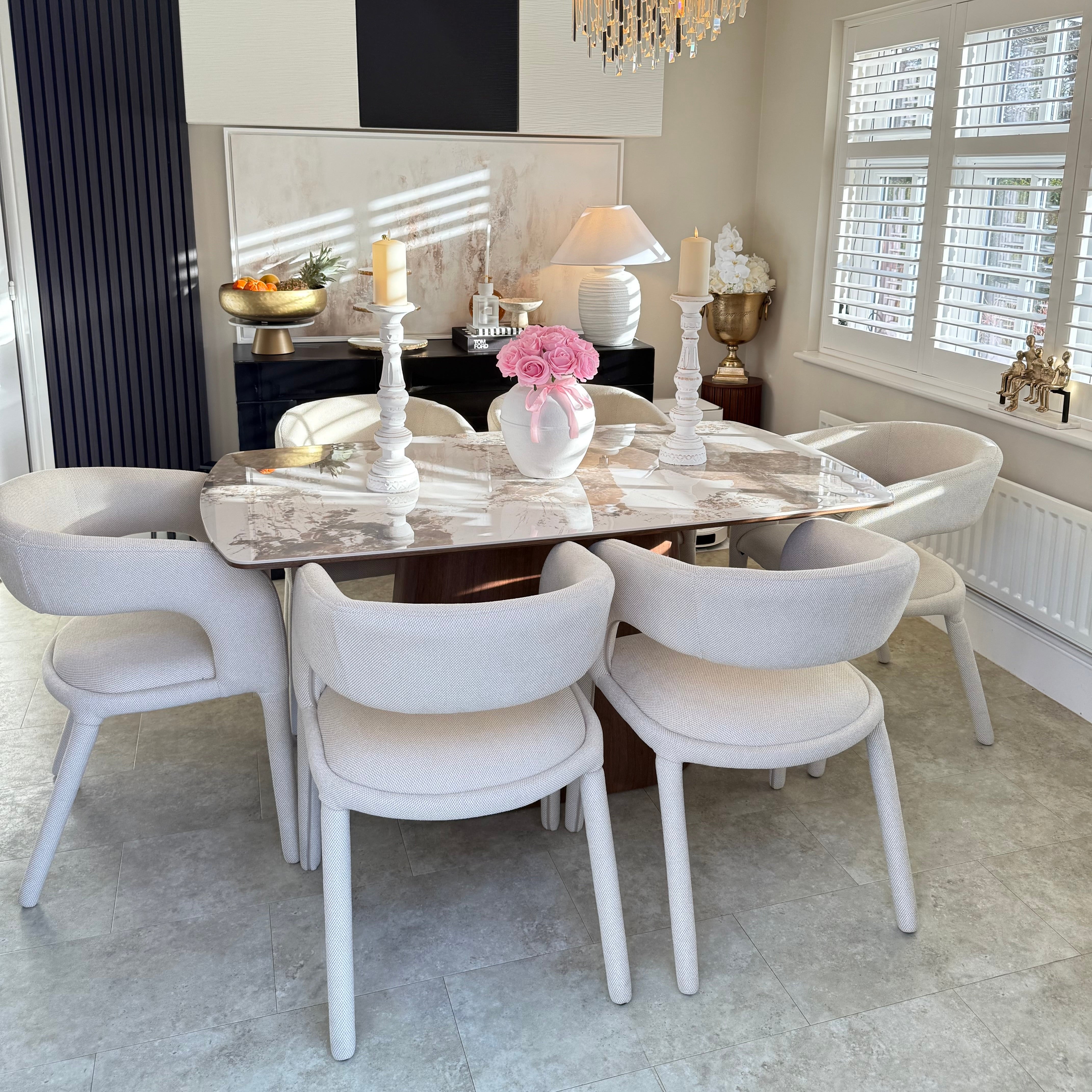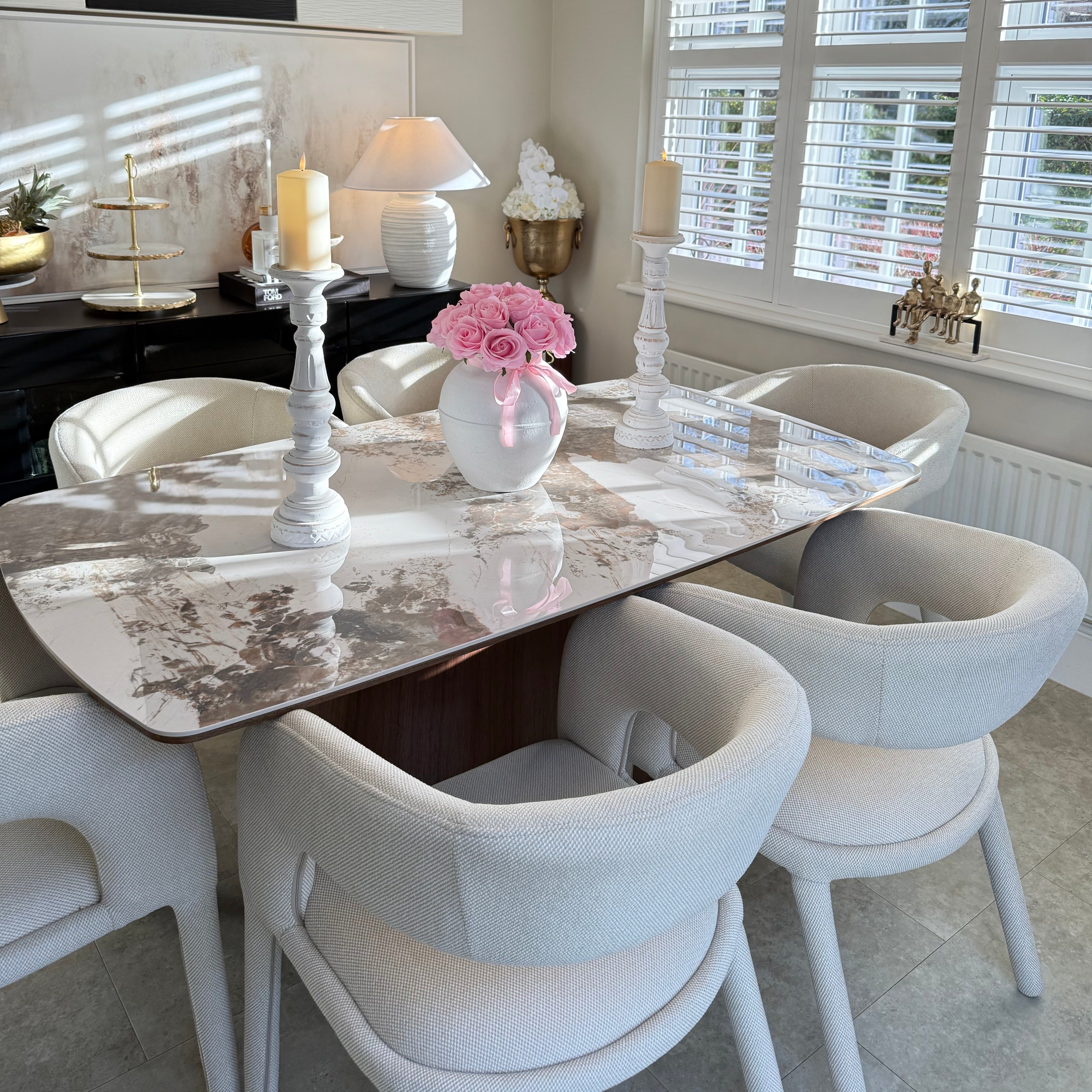The Eton Brown Wood Dining Table combines warmth and elegance, making it a stunning focal point for your dining space. With its rich brown veneer and travertine-look surface, it offers a sophisticated balance of natural beauty and modern design.