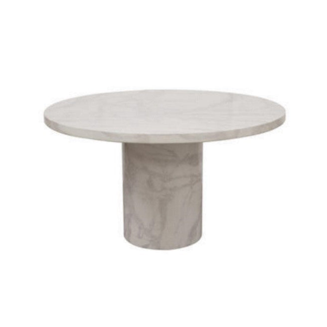 The Carra Round Dining Table is a clean and minimalist marble centrepiece finished in a white bone colour with natural marble patterns.
