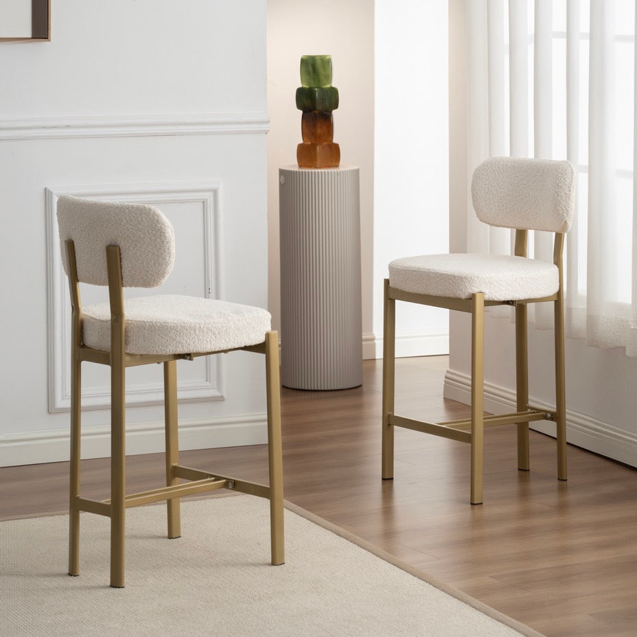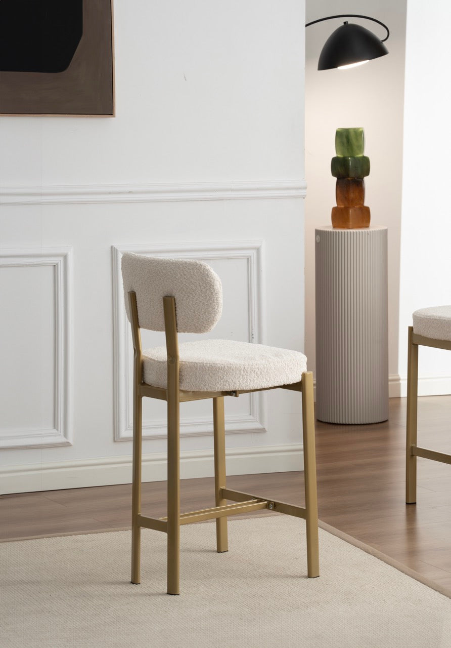 The Maya Barstool brings soft texture and a subtle touch of shine to your kitchen or bar area. Upholstered in a warm, boucle inspired fabric and paired with matte gold legs, it blends comfort with a refined contemporary feel.