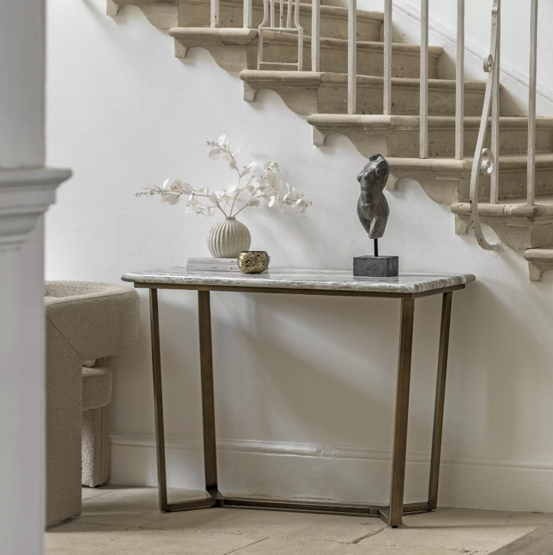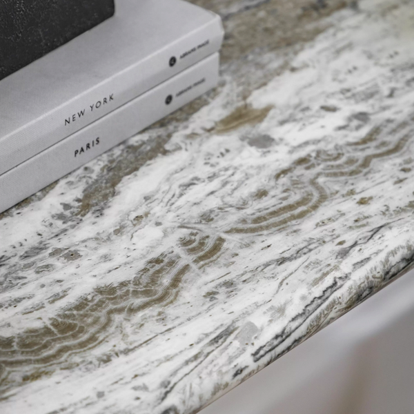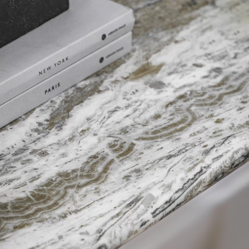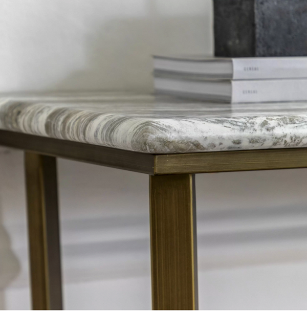 Add a touch of sophisticated elegance to a room with this lovely console table. The top features the most amazing green-grey marble faux finish which is created with the latest state of the art technology to give the look and feel of the real thing but without the weight and technical difficulties. The faux marble pairs beautifully with the metal legs and underframe which has a classy bronzed brass finish, to give an understated luxury style, perfect for any classic modern interior. Matching items also available.