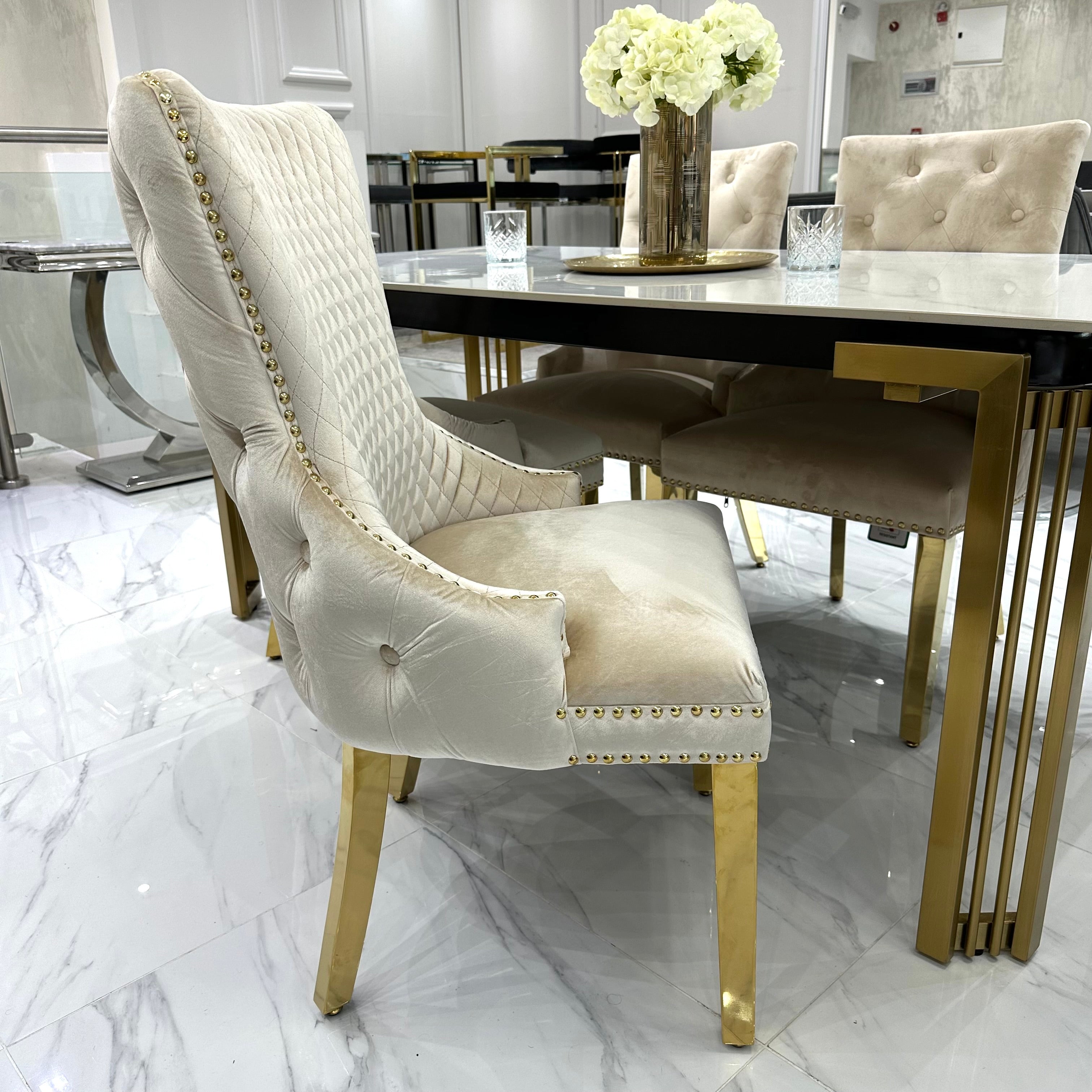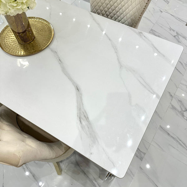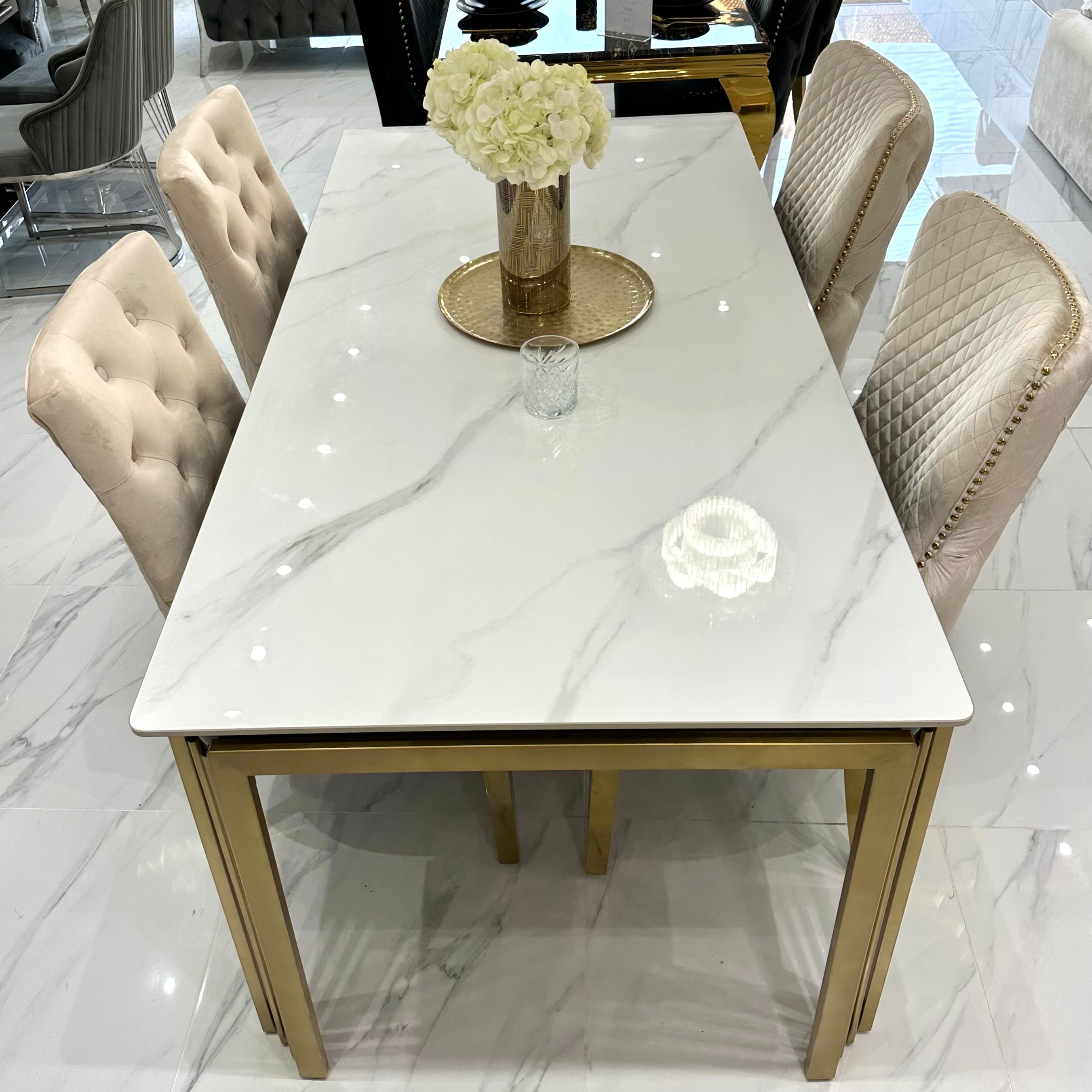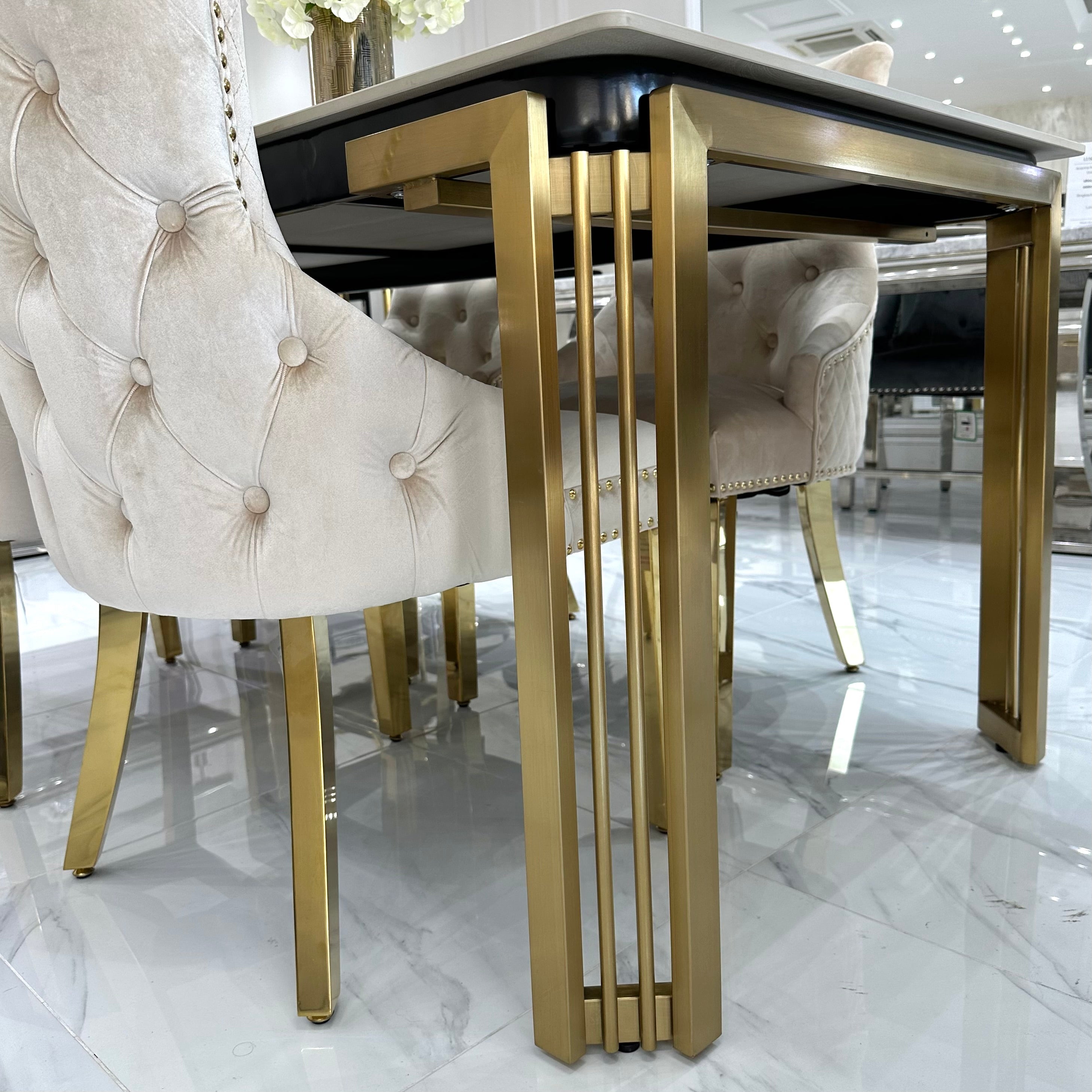 Stylish grandeur providing an instant focal point to your room, the Sorrento dining table is perfect for those who aspire to a stylish dining experience. This is truly a beautiful dining table, made with a solid metal gold frame with gorgeous detailed legs, it offers a timeless look of style and quality.